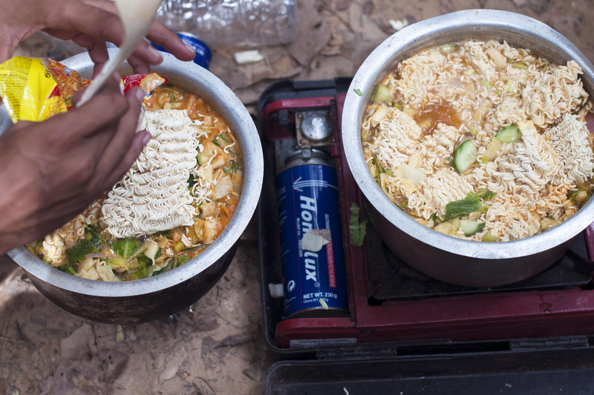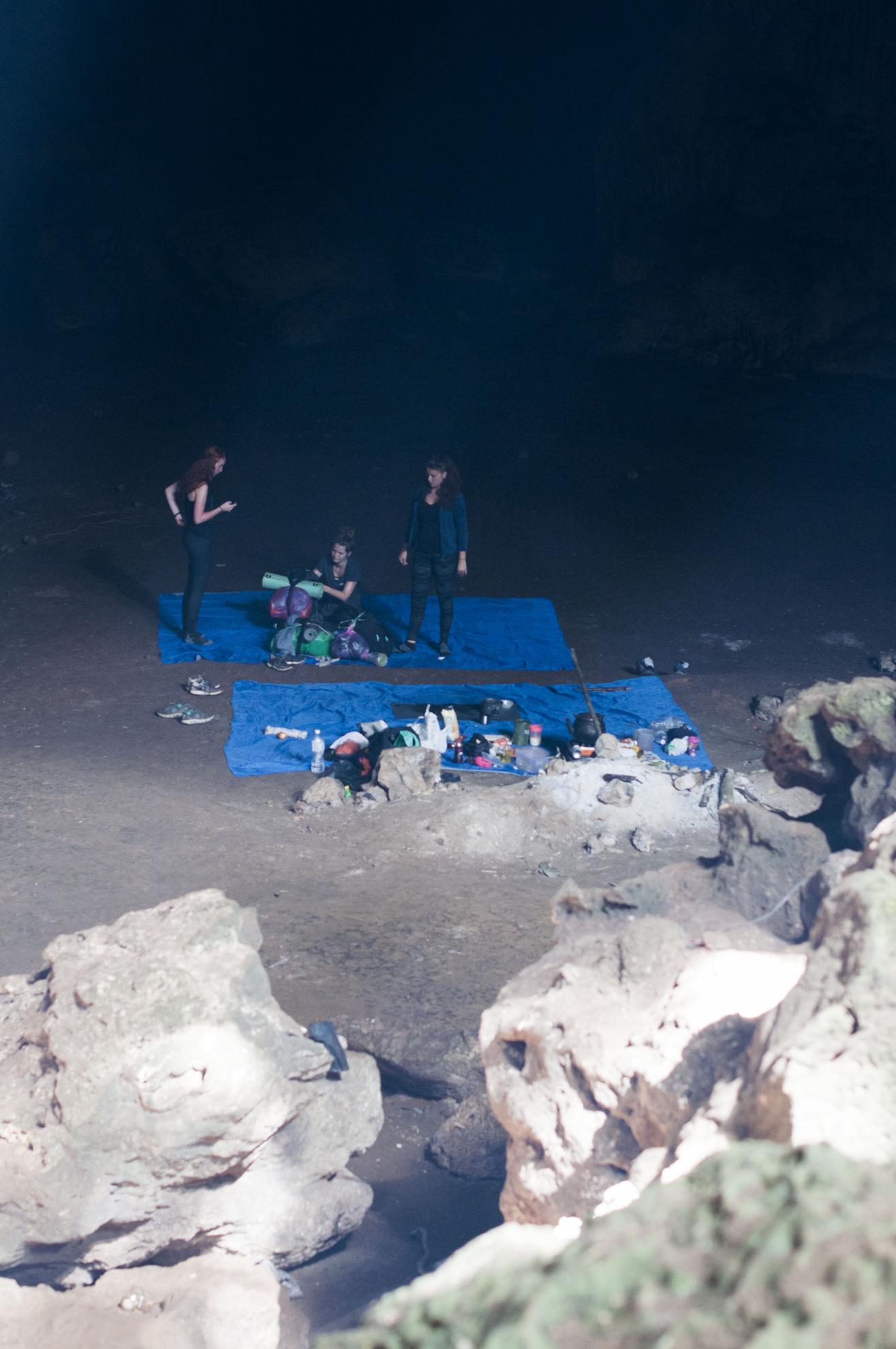 Da-i si umfla la loc toate pet-urile carate cu noi si mergi, familie, la rau sa le umplii cu apa, ca mancarea nu se face asa simplu 🙂 Si mai fa-ti si-un dus la rau daca poti, asa cand se-mbina ziua cu noaptea si cand e cel mai bine sa stai inauntru si nu afara. Si ca la picnicele romanesti, ne-am apucat sa taiem legumele, sa curatam usturoiul si sa facem o frumuste de curry la plic de-arunci cu caciula-n pantere si alta nu 🙂 Dupa masa o parte din curajosii grupului s-au dus la o plimbare nocturna, nu mai departe de 200 de metri de pestera si s-au intors cu tot cu ghid, dupa ce-au auzit ceva fosnete suspecte ce veneau din fata lor. Doi ochi verzi ne-au urmarit din intuneric minute intregi iar porcii spinosi nu ne-au lasat sa dormim toata noaptea la cat de tare au inceput sa miroasa toate lucrurile din jurul nostru si sa scormoneasca dupa dumicati lasati nemancati.