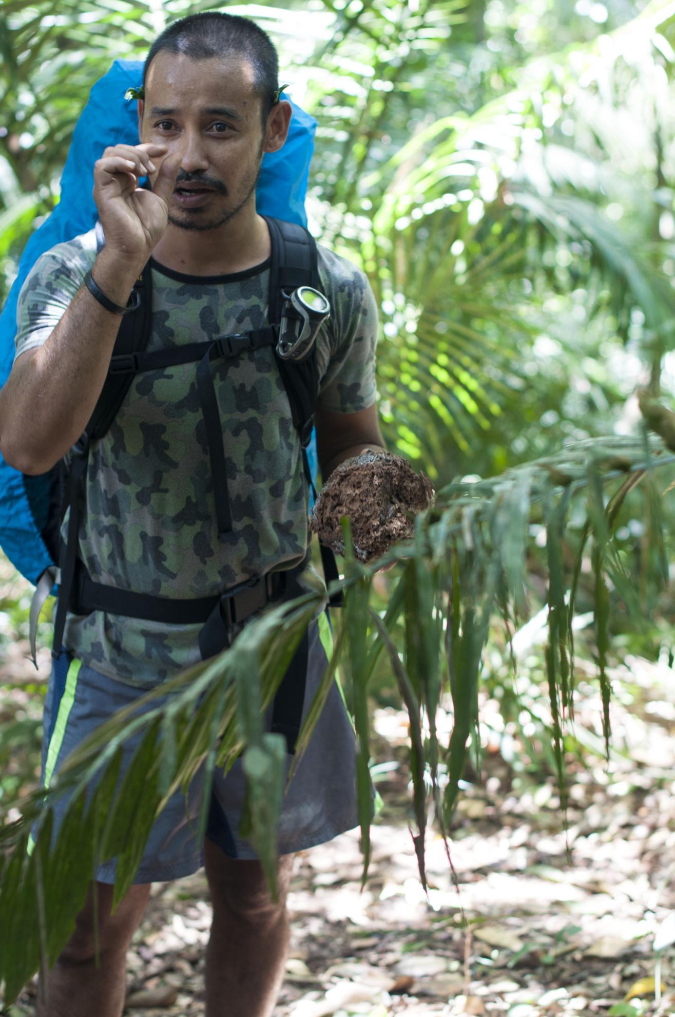 10 oameni si doi ghizi, unu-n fata celalalt la coada, cu ochii mari sa suprindem fiecare miscare si cu urechile palnie dupa fiecare zgomot. Fara arme moderne, doar doua macete si curaj. Dupa nici o ora ne intalnim cu primele urme de animale. Suntem pe teritoriul elefantilor! Printre cele mai periculoase pentru om ca doar sunt cu gramada aici si nu-s obisnuiti cu oamenii la fel ca cei din Africa. Stau ascunsi printre frunze si copaci si-si protejeaza pana la moarte puii, ca tot e timpul lor acum. Hai sa speram ca nu dam nas in nas cu nicio familie ca tare n-am vrea sa alergem la vale si sa ne suim prin copaci 🙂