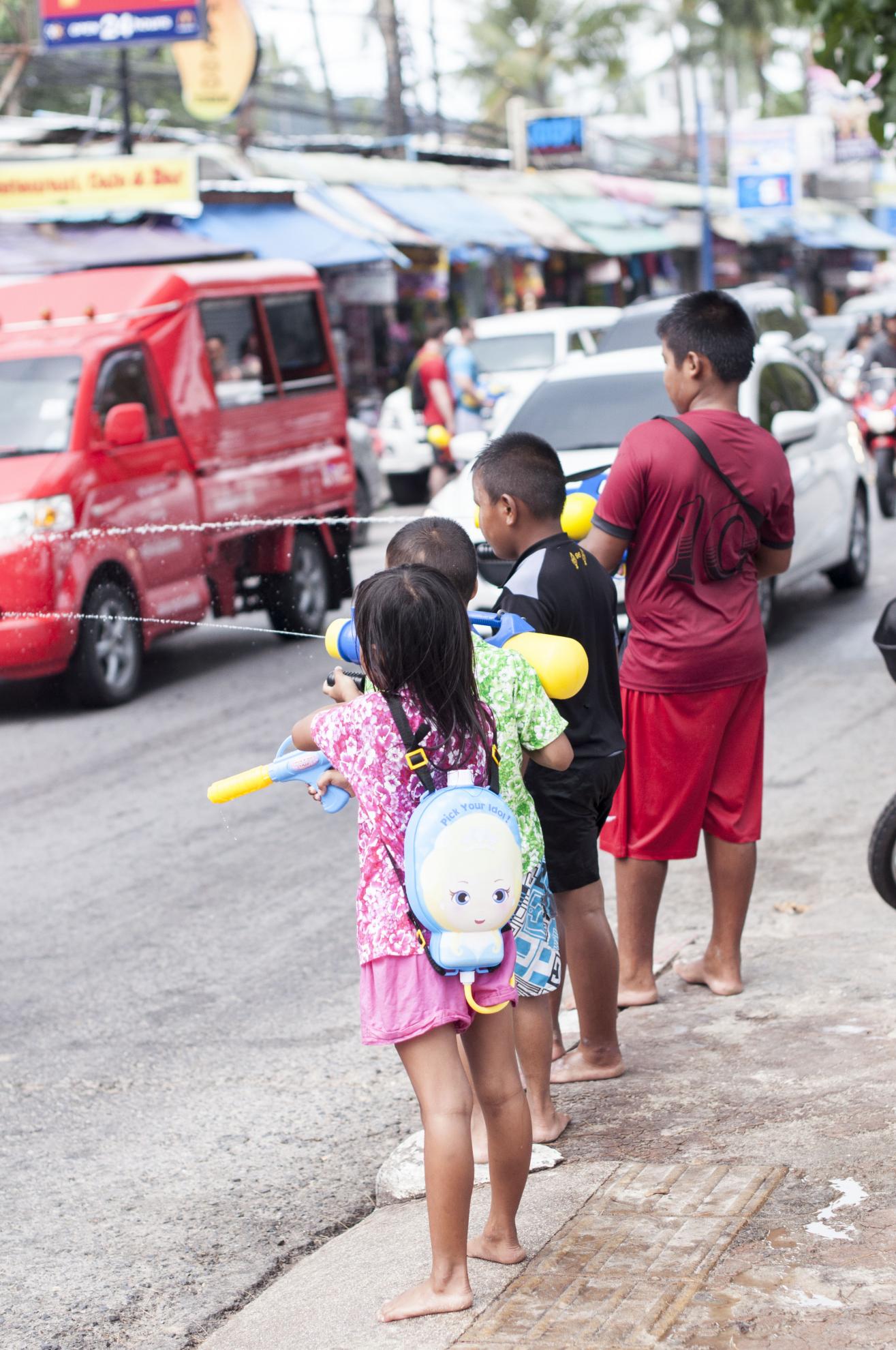 Prima oara in viata noastra de Songkran in Thailanda. Si nu oriunde, ci-n Phuket. Imaginati-va o nebunie de bataie cu apa si spuma de dimineata pana seara si inmultiti-o cu 100 caci s-ar putea sa fie cel mai intersant si inedit party din toate timpurile 🙂 Pe noi, cel putin, ne-a luat prin suprindere. Am fost avertizati de Ying c-o sa fim uzi din cap pana-n picioare, de dimineata si pana seara dar ca n-o sa avem incotro si ca n-o sa gasim nicio portita de iesire din toata nebunia, la asta chiar nu ne asteptam. Asa ca pe 12 aprilie, incepand cu ora 14, toate magazinele s-au golit de lucruri ce tin de ploaie si toate pistoalele s-au umplut cu apa. Pelerine, huse impermeabile pentru telefon, pistoale, mitralieriere, galeti, toate si-au gasit cate un stapan.